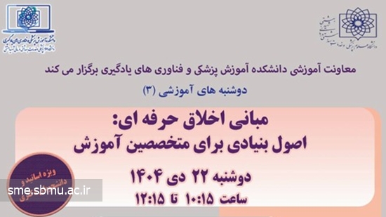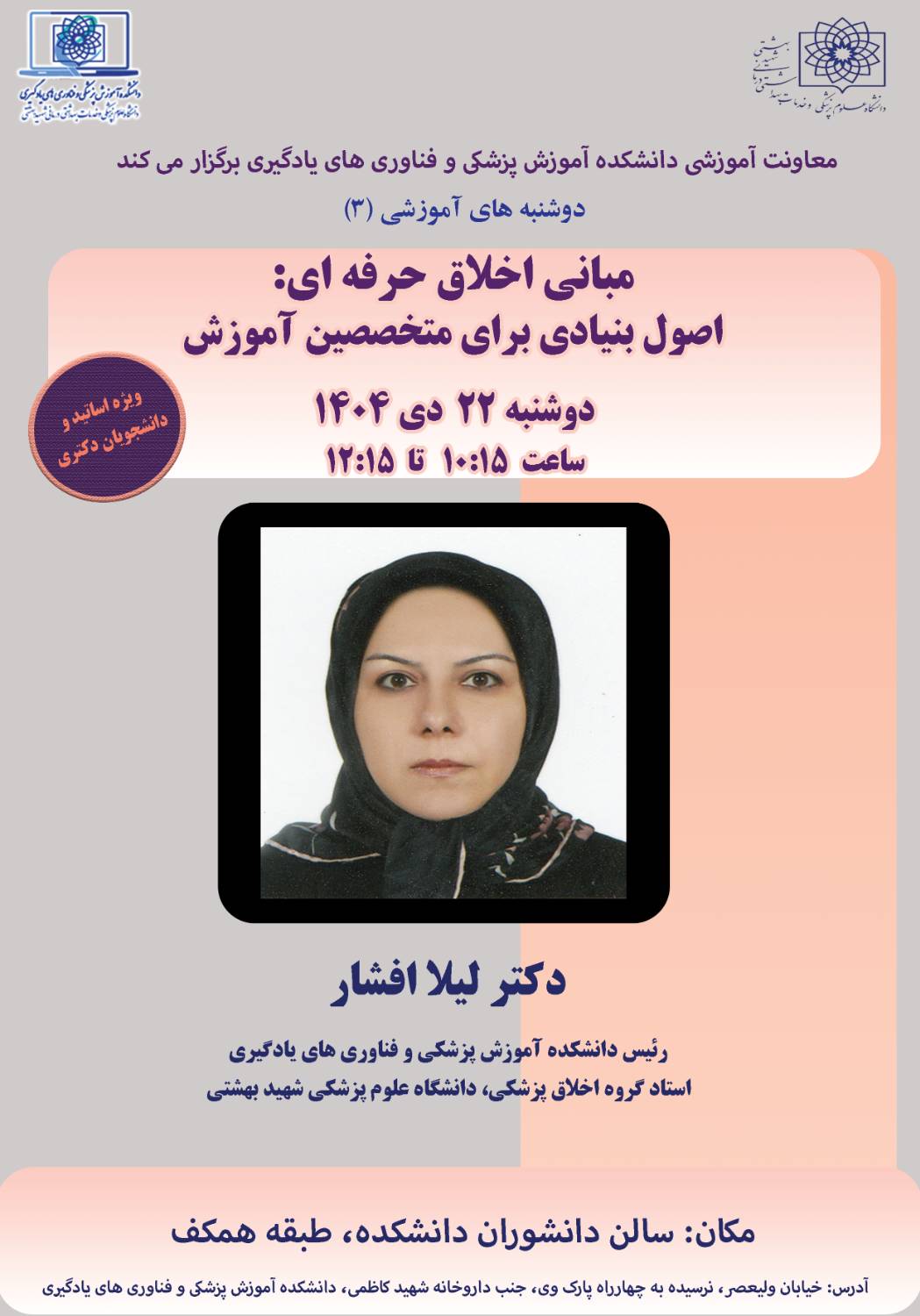 مدرس: سرکار خانم دکتر لیلا افشار (رئیس دانشکده آموزش پزشکی و فناوری های یادگیری و استاد گروه اخلاق پزشکی دانشگاه علوم پزشکی شهید بهشتی